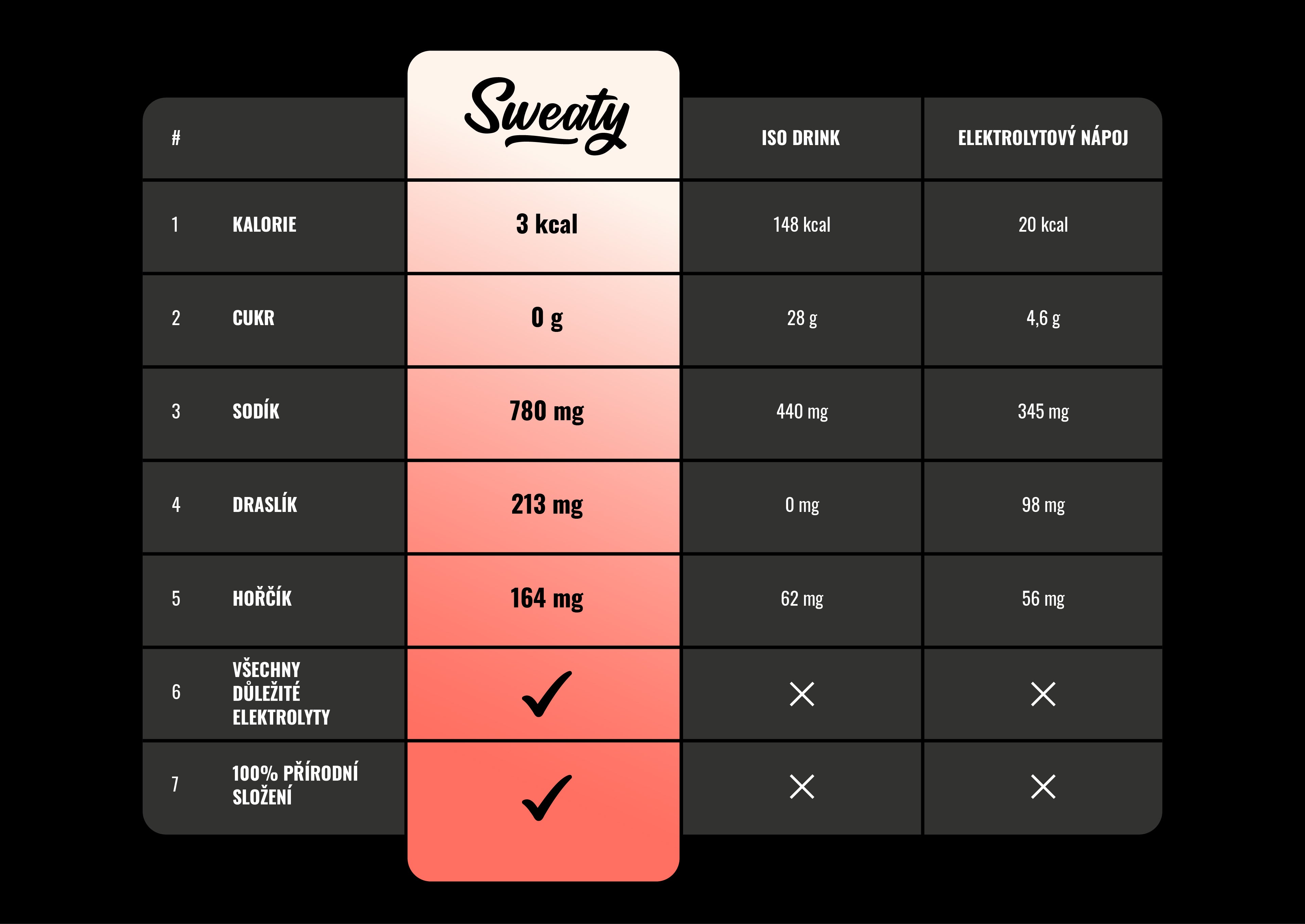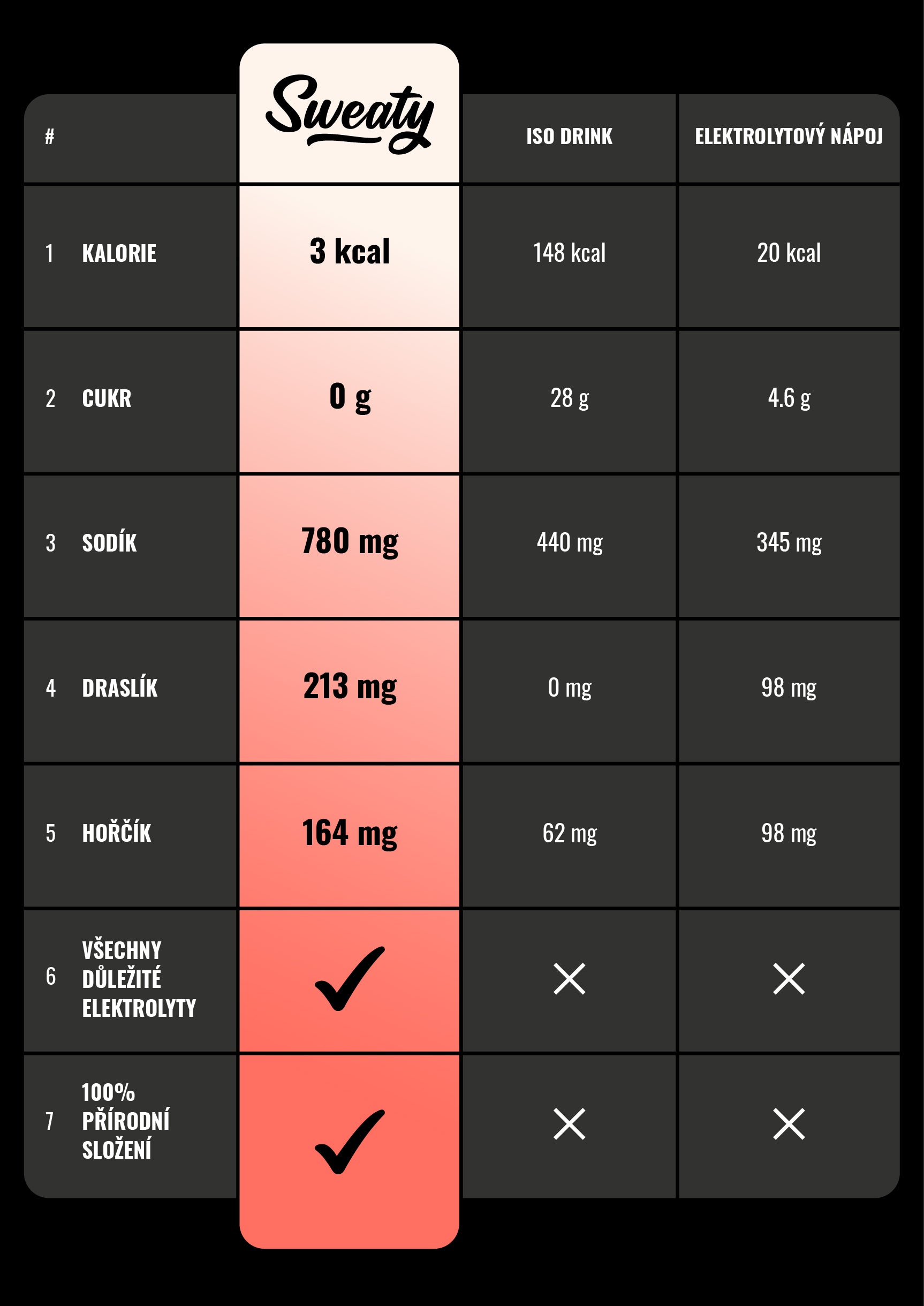 Při pocení ztrácíš elektrolyty a pokud je neobnovíš, může dojít k dehydrataci, únavě a svalovým křečím. Sweaty dodává 6 klíčových elektrolytů, které podporují výkon a regeneraci.