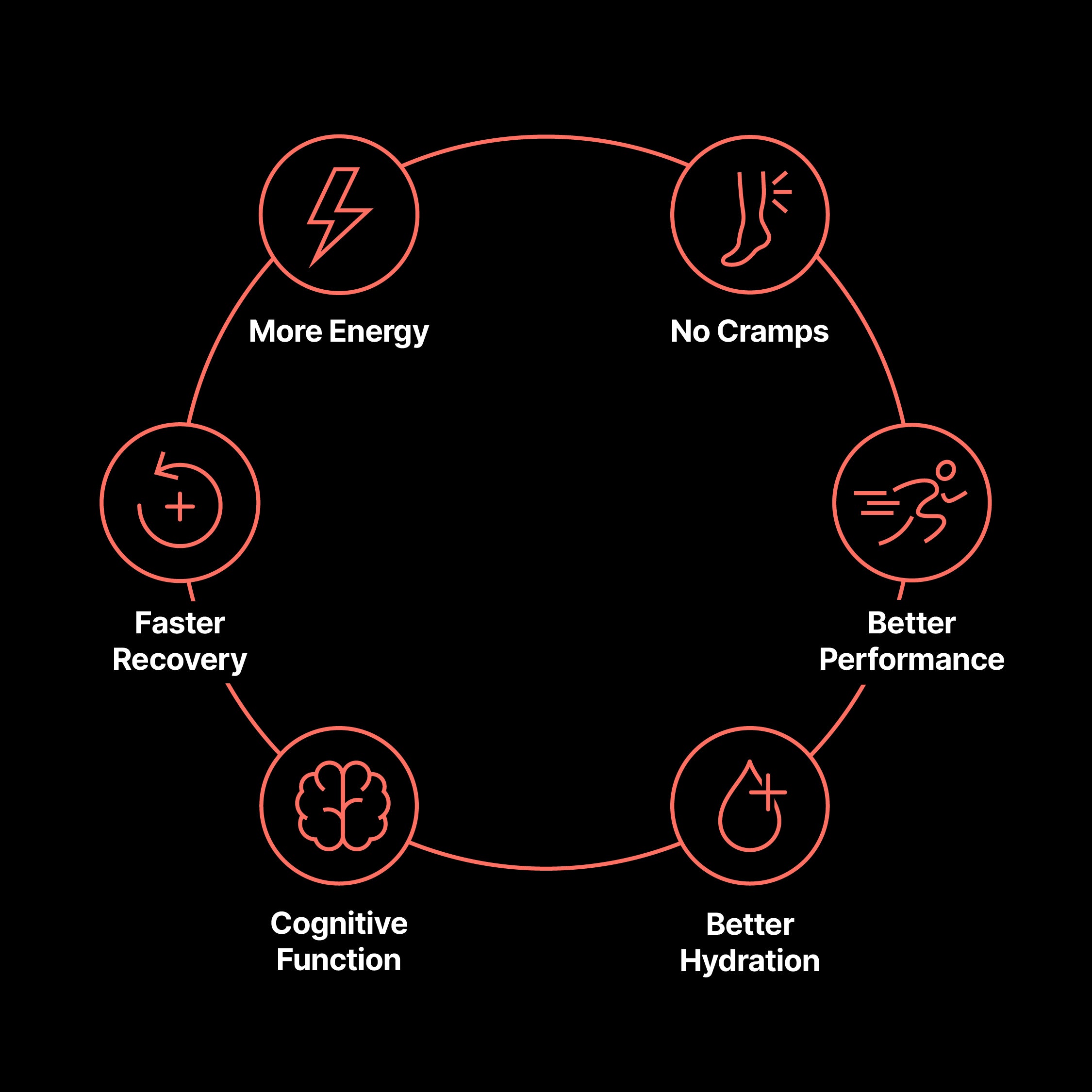 Electrolytes are minerals that your body loses through sweat. Without replenishing them, you may experience dehydration, muscle cramps, fatigue, or slower recovery. Sweaty delivers all six key electrolytes in an optimal balance: